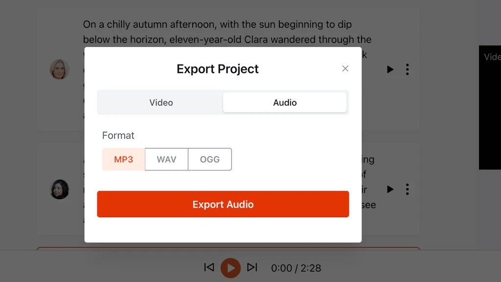 • Save your audio in different file formats like MP3, WAV, or OGG